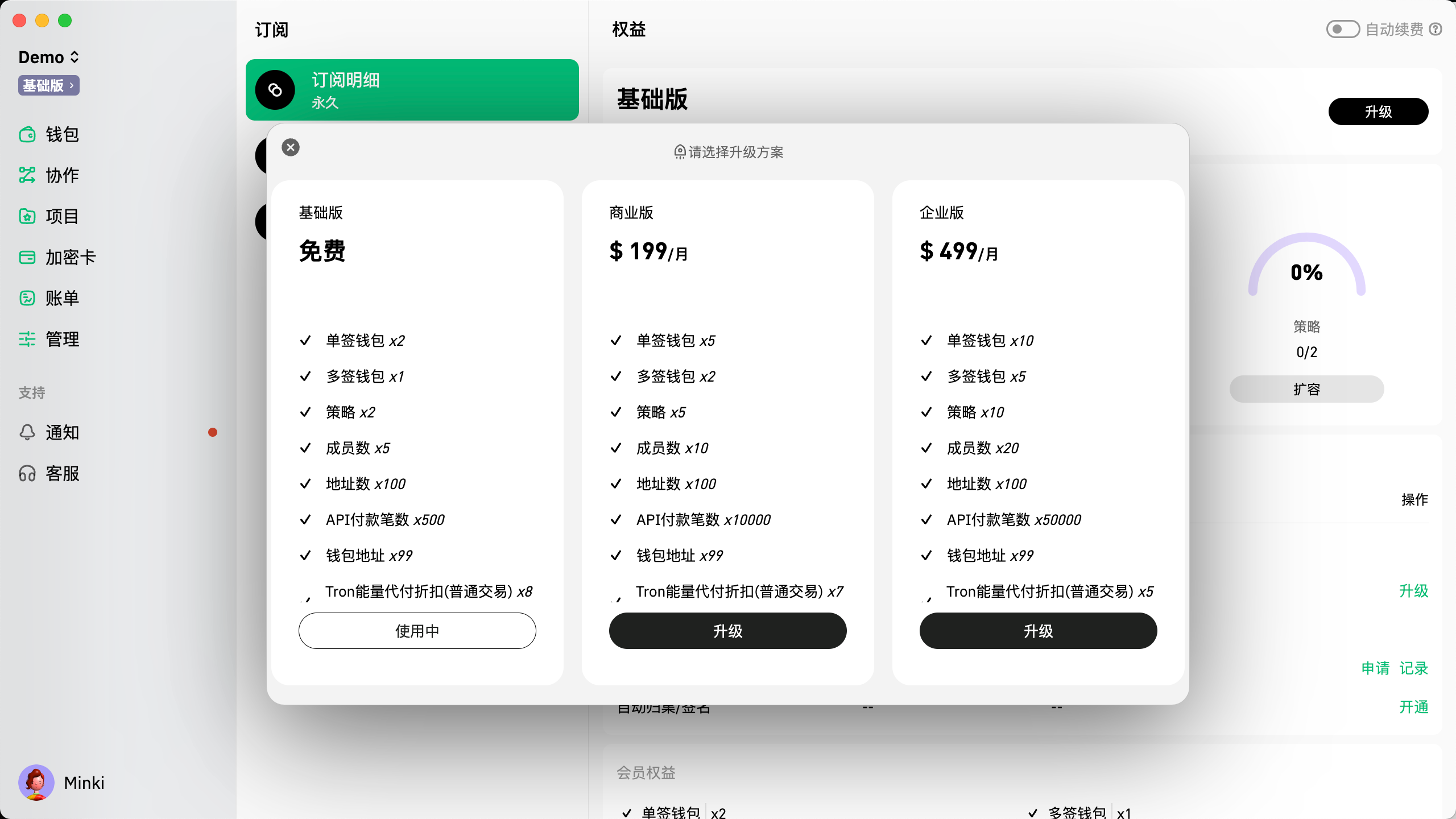 窗口会弹出显示Cregis提供的方案,确定方案后,您可以点击该方案中的「升级」按钮。