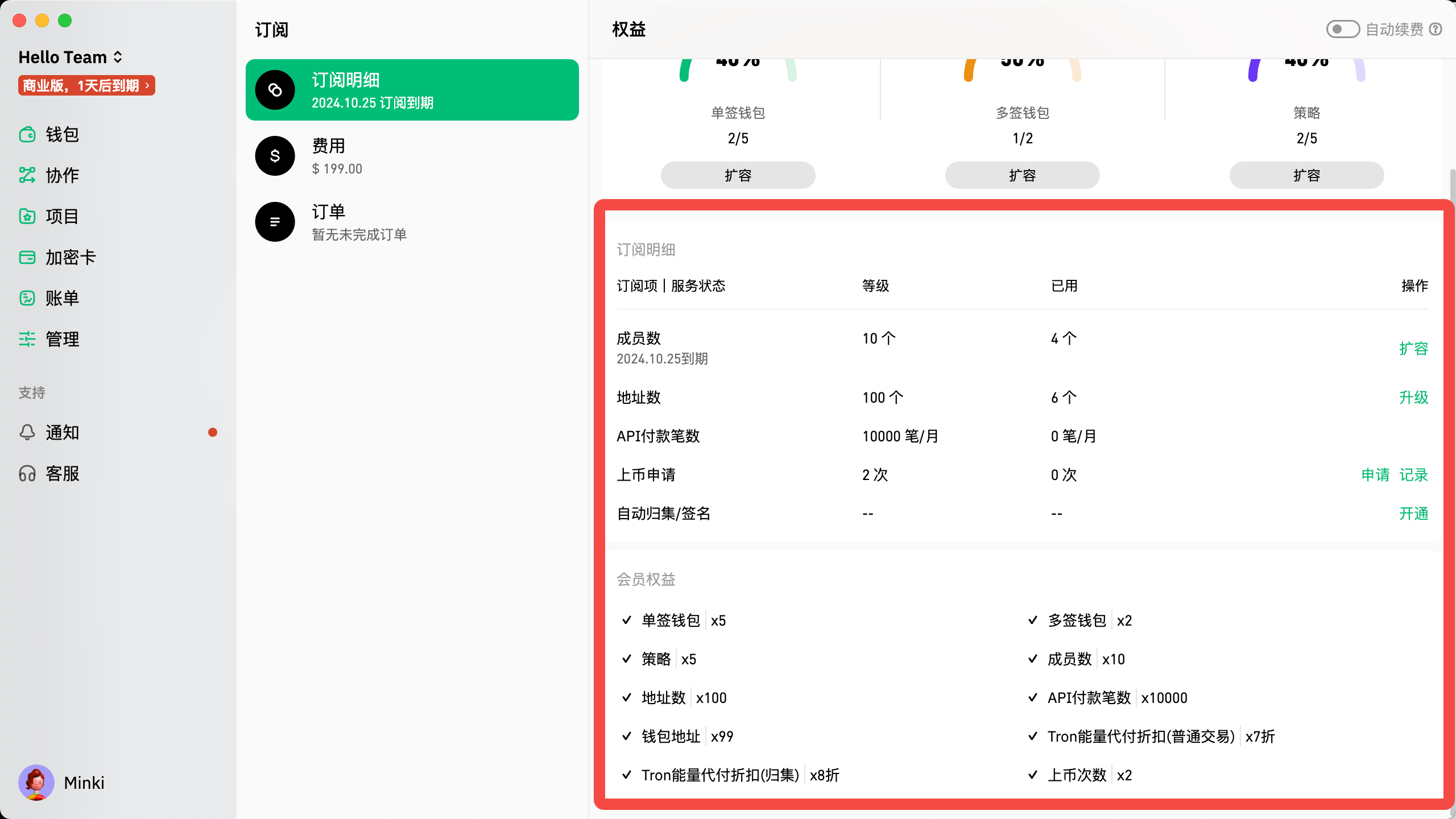 在此页面,您可以查看订阅详情、当前方案的权益以及订阅的到期日期。