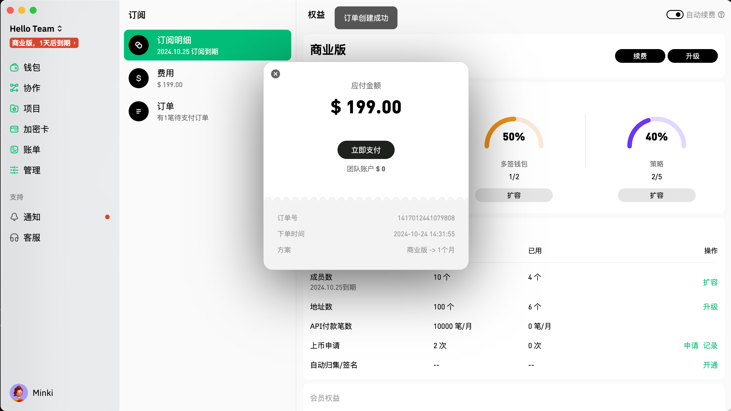 点击“立即支付”完成订单。请确保您的账户余额充足,您可以参考“充值团队账户”获取充值指南。