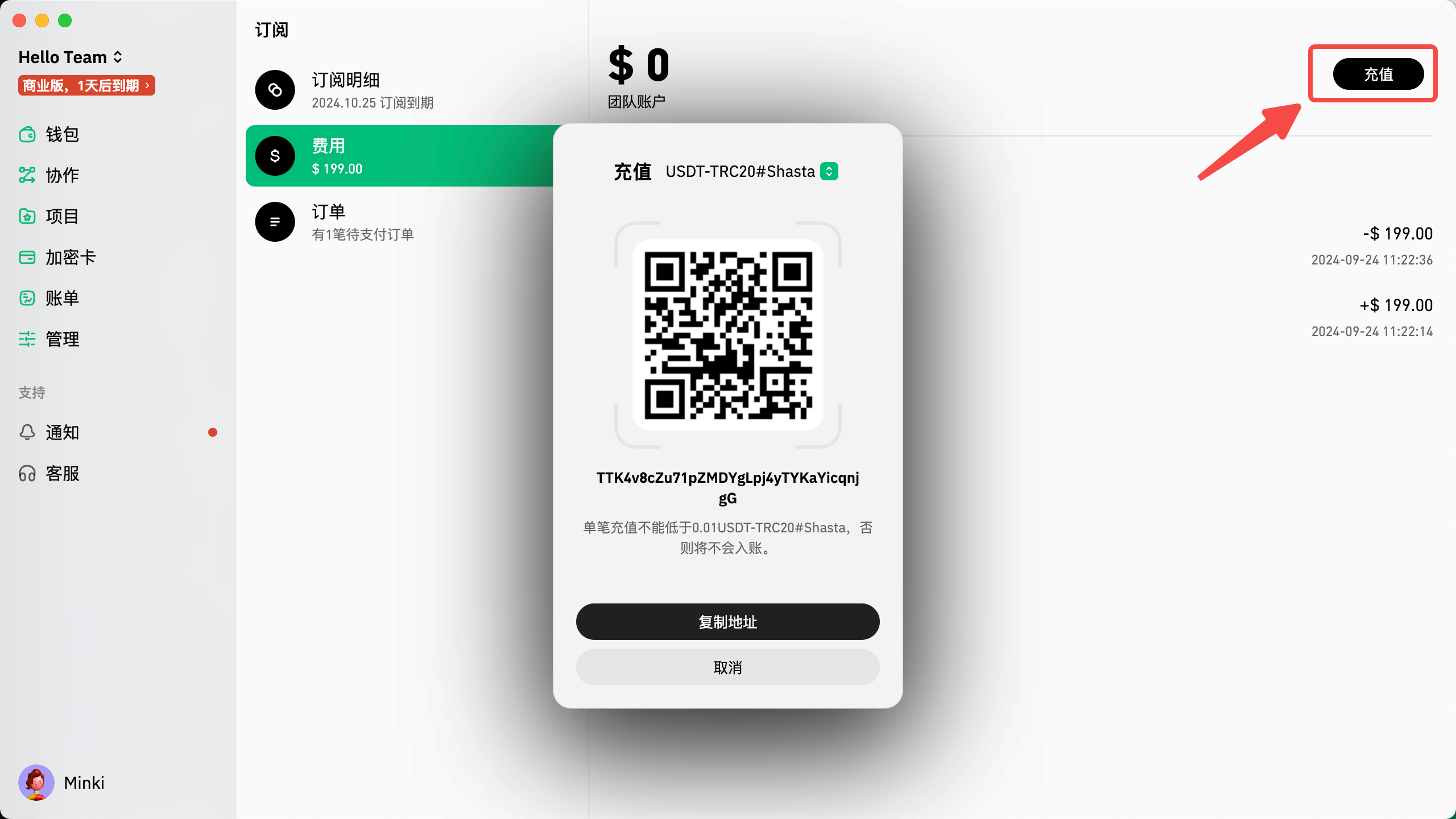2. 点击“充值”，弹出窗口将显示加密地址。<br>