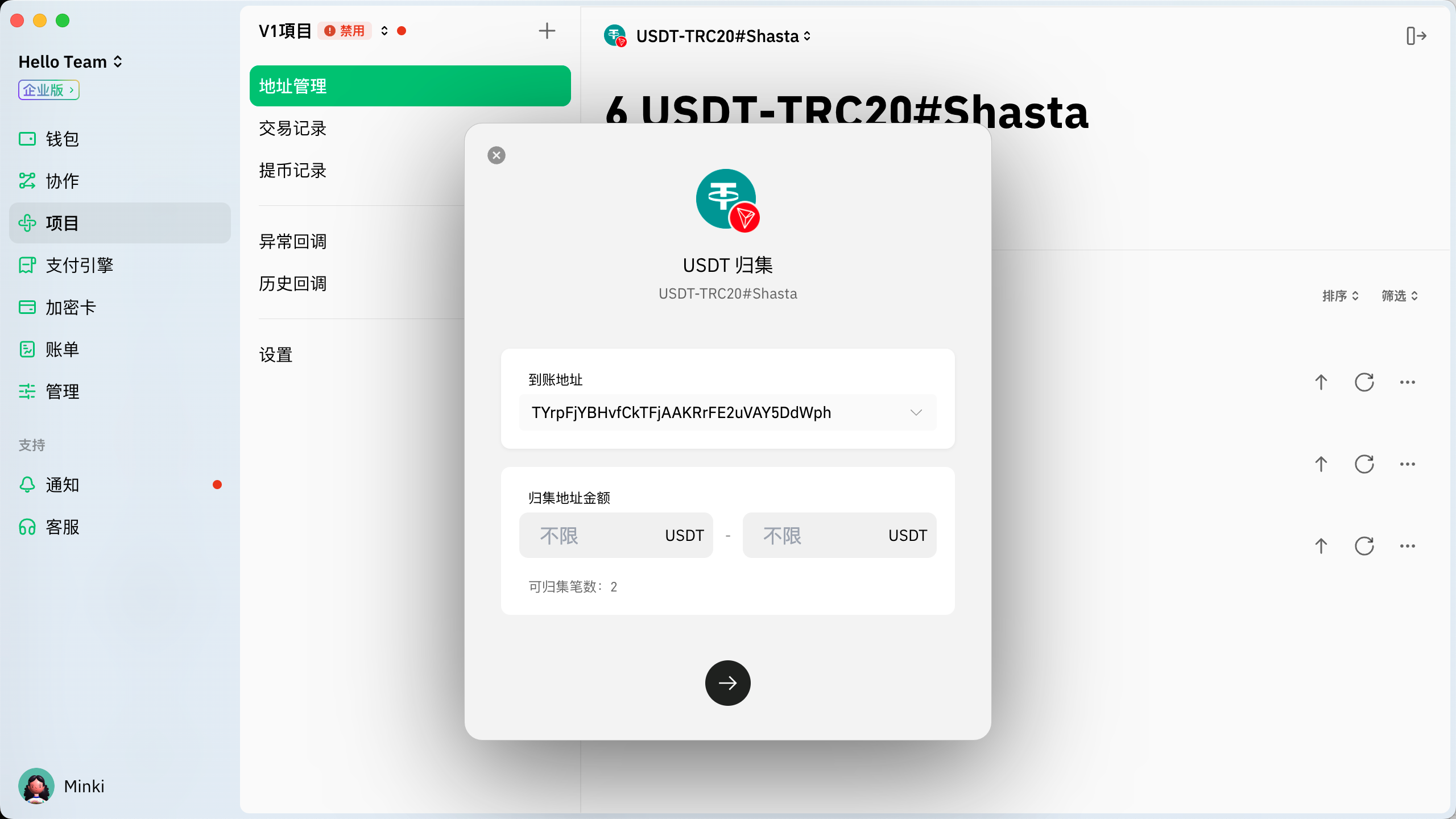 如果用户在项目中设置了多个子地址且每个地址都有资产,拥有归集权限的用户可以将所有子地址的资产收集到指定的钱包地址,方便用户管理和使用。成功收集的资金和Gas费用可以在钱包的交易记录中查询。归集的操作可手动操作或通过API发起。