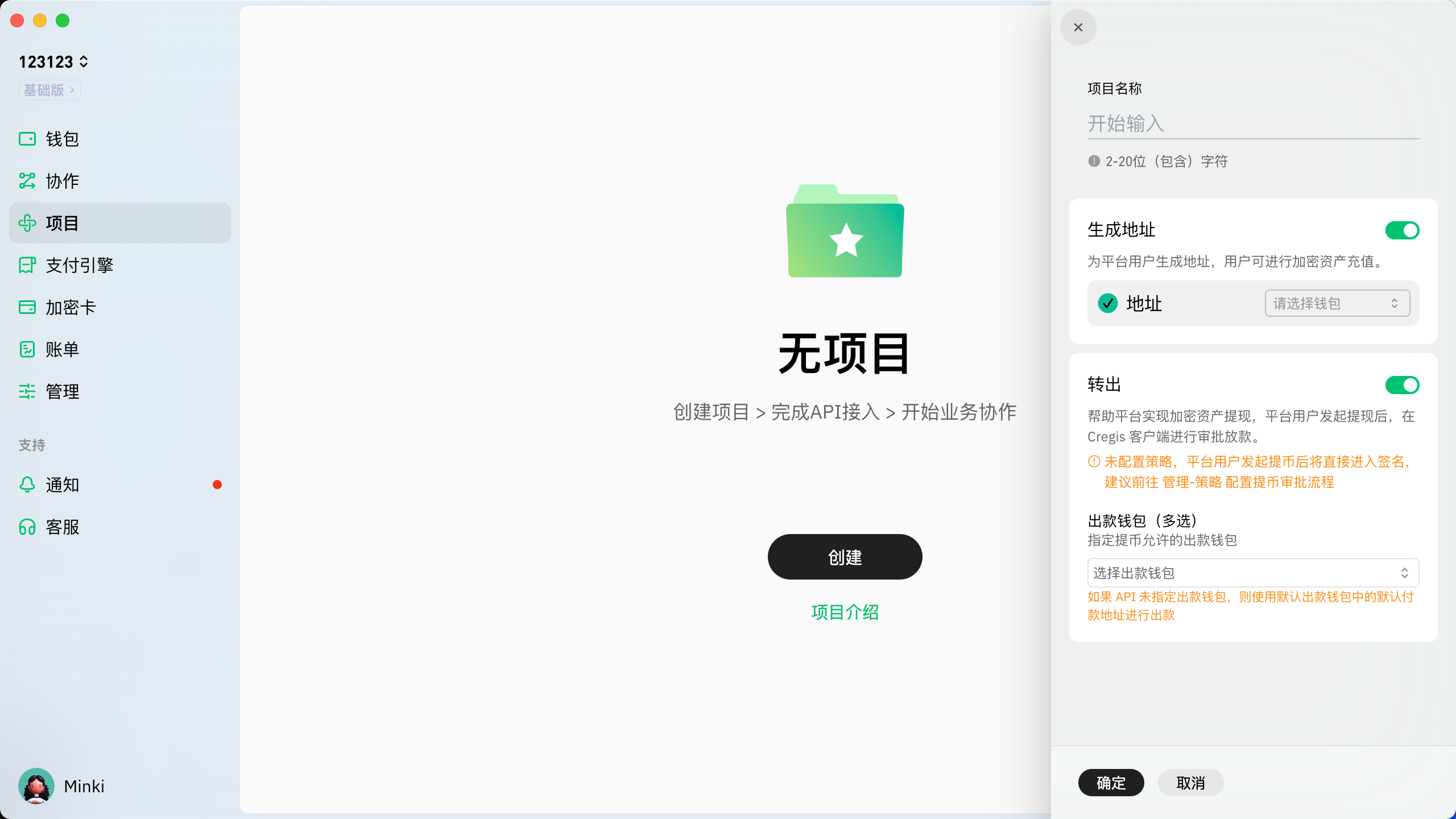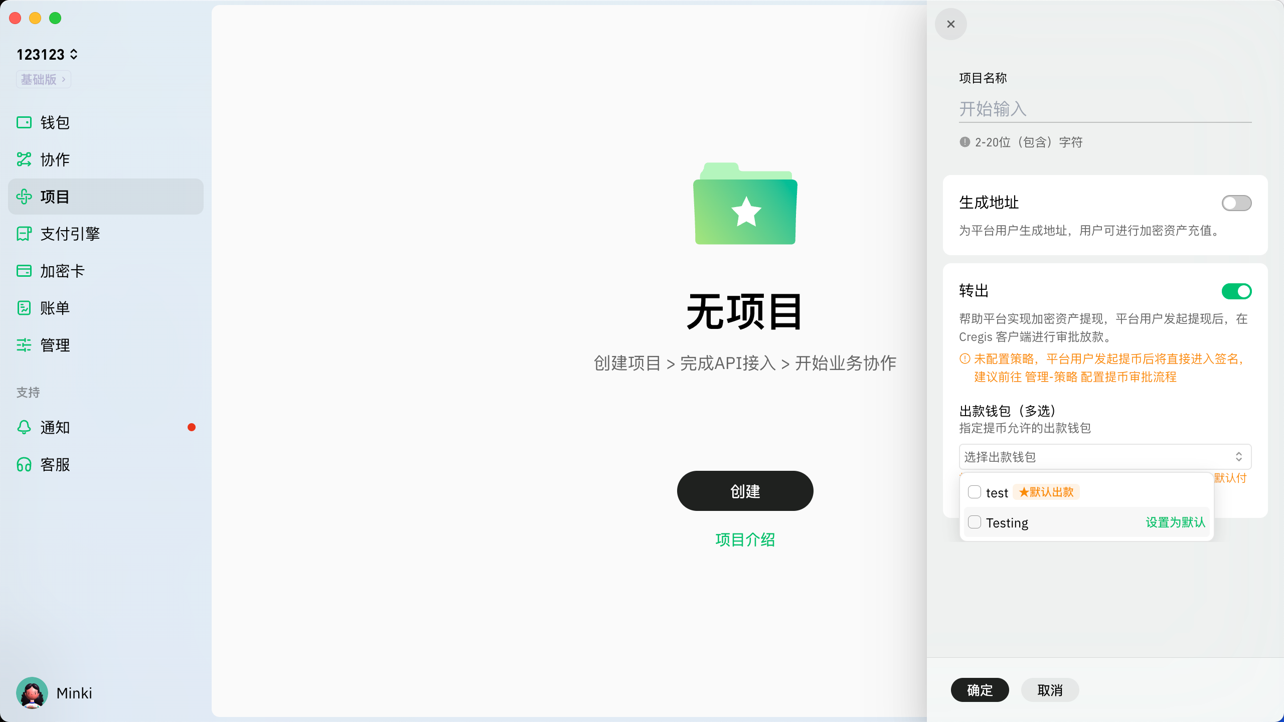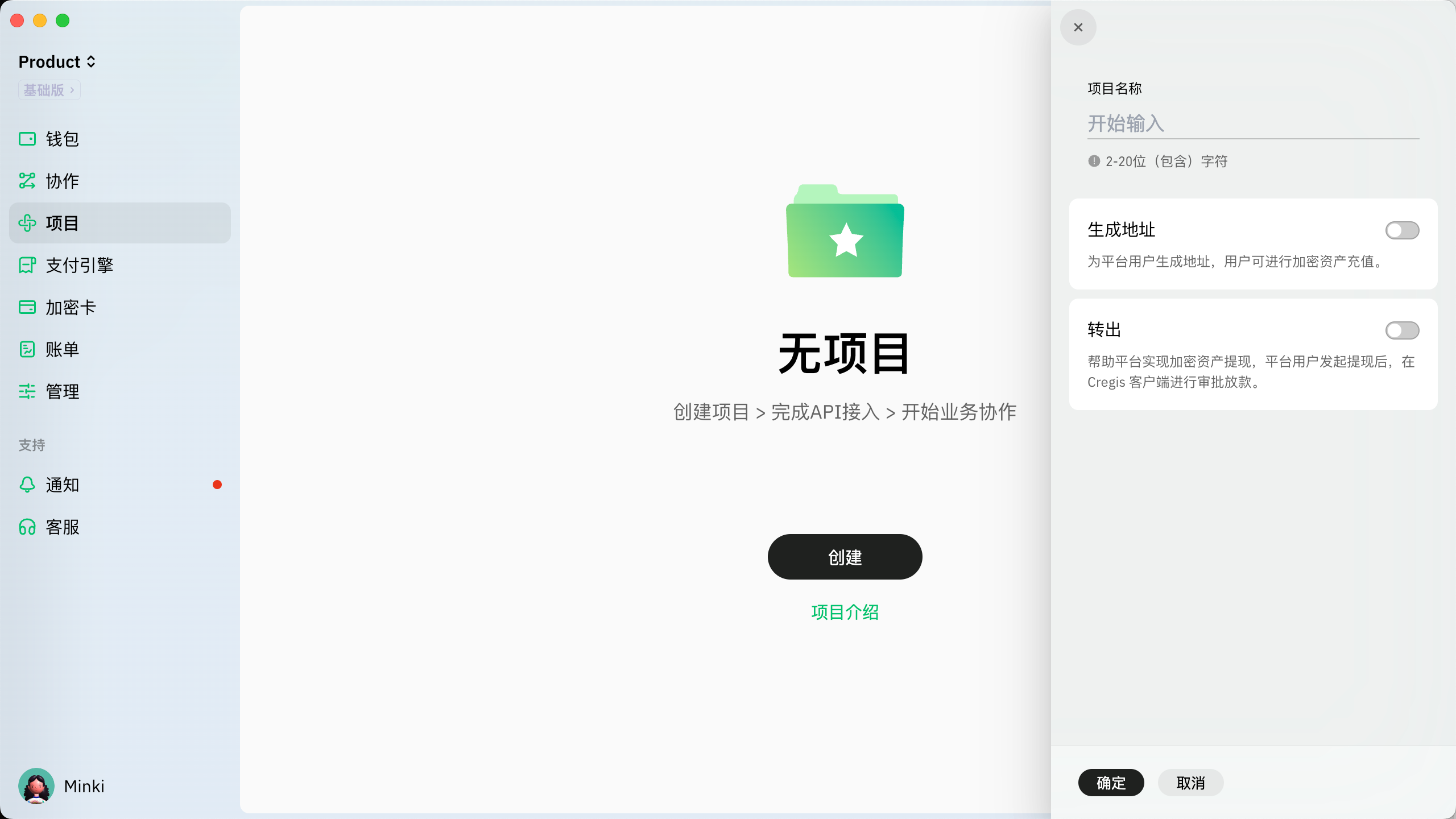 2. “创建项目”界面将弹出在右侧。输入项目名称并选择项目所需的接口类型，可以同时开启多种接口类型。您可以[在此](https://support.cregis.com/zh-cn/api/jie-kou-zhong-lei)查看API接口类型的详细信息。<br>