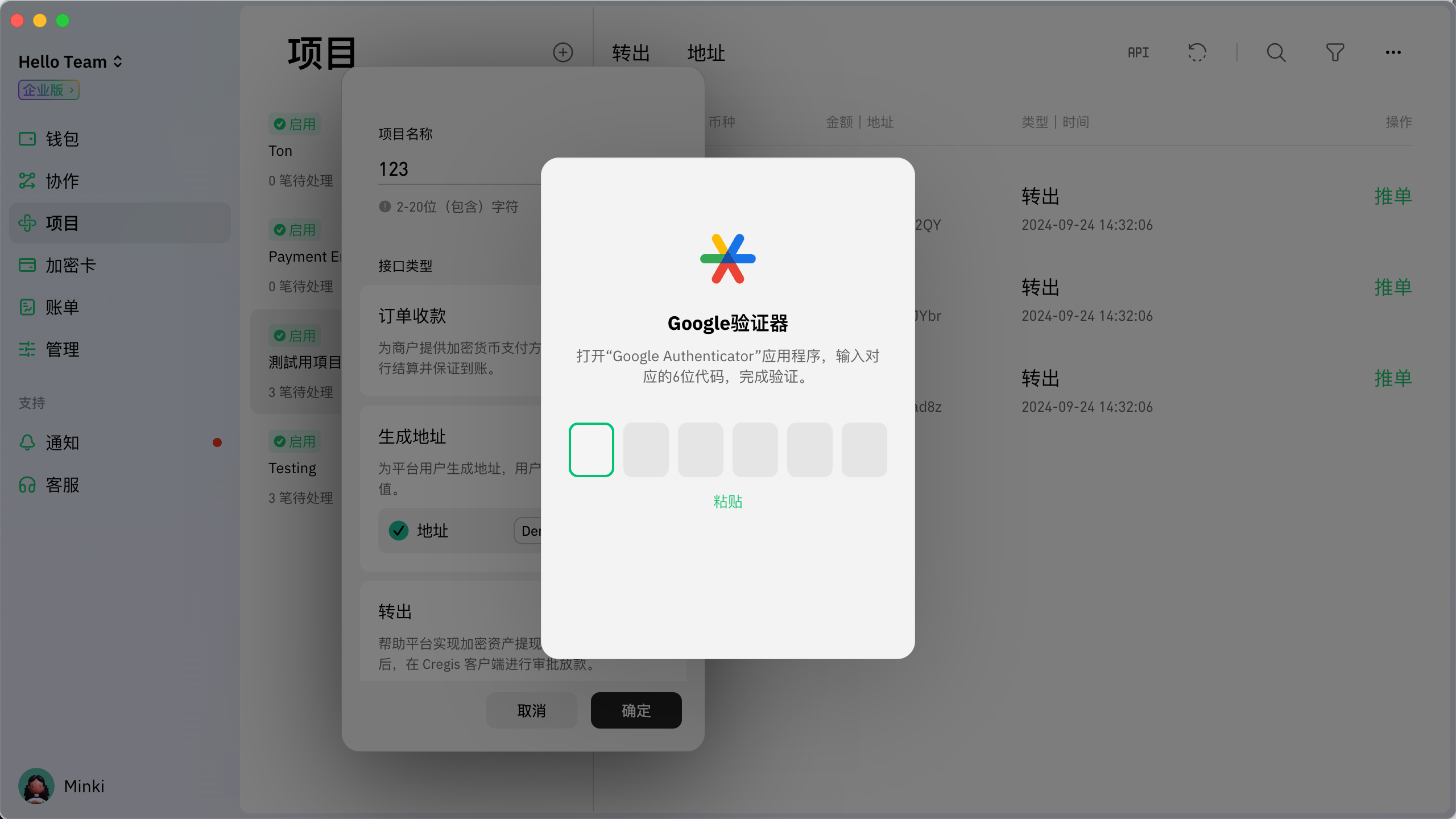 3. 输入Google 2FA验证码进行验证。验证成功后，项目将成功创建。<br>