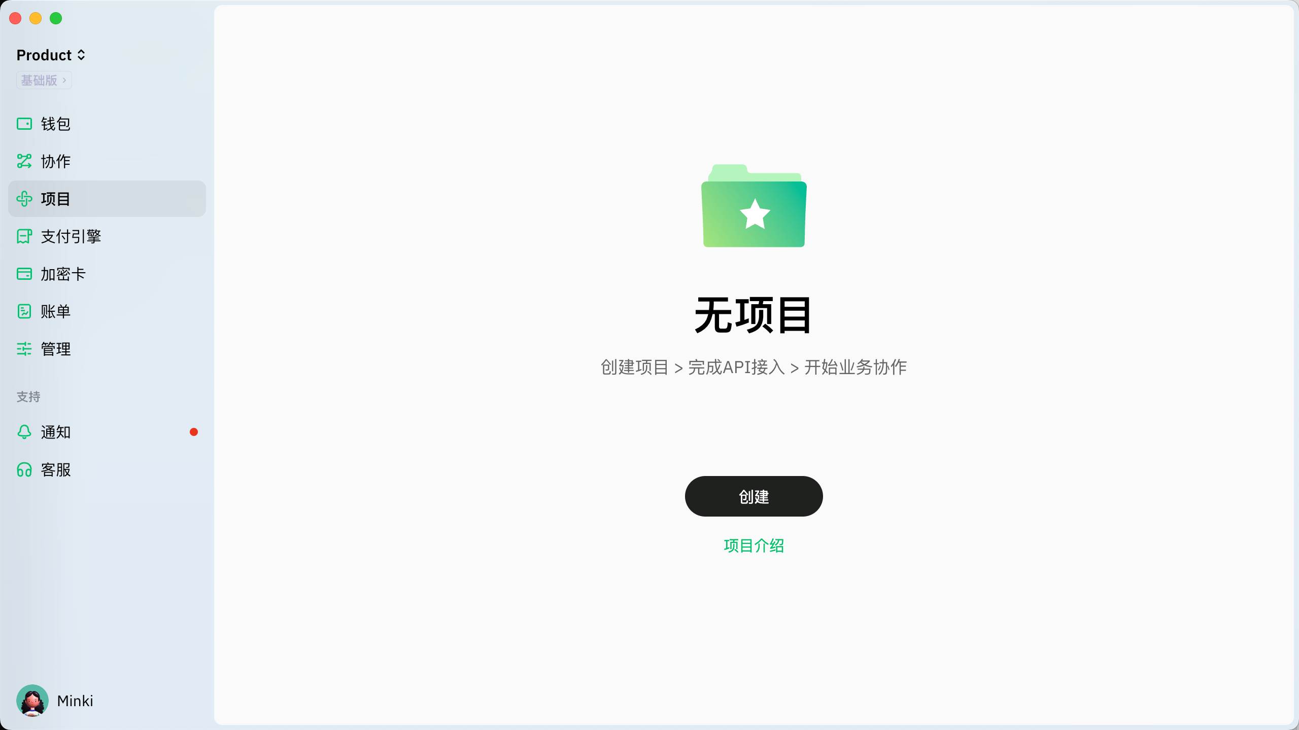 1. 点击“API”模块进入项目页面。首次使用项目时，点击“创建”按钮。<br>
