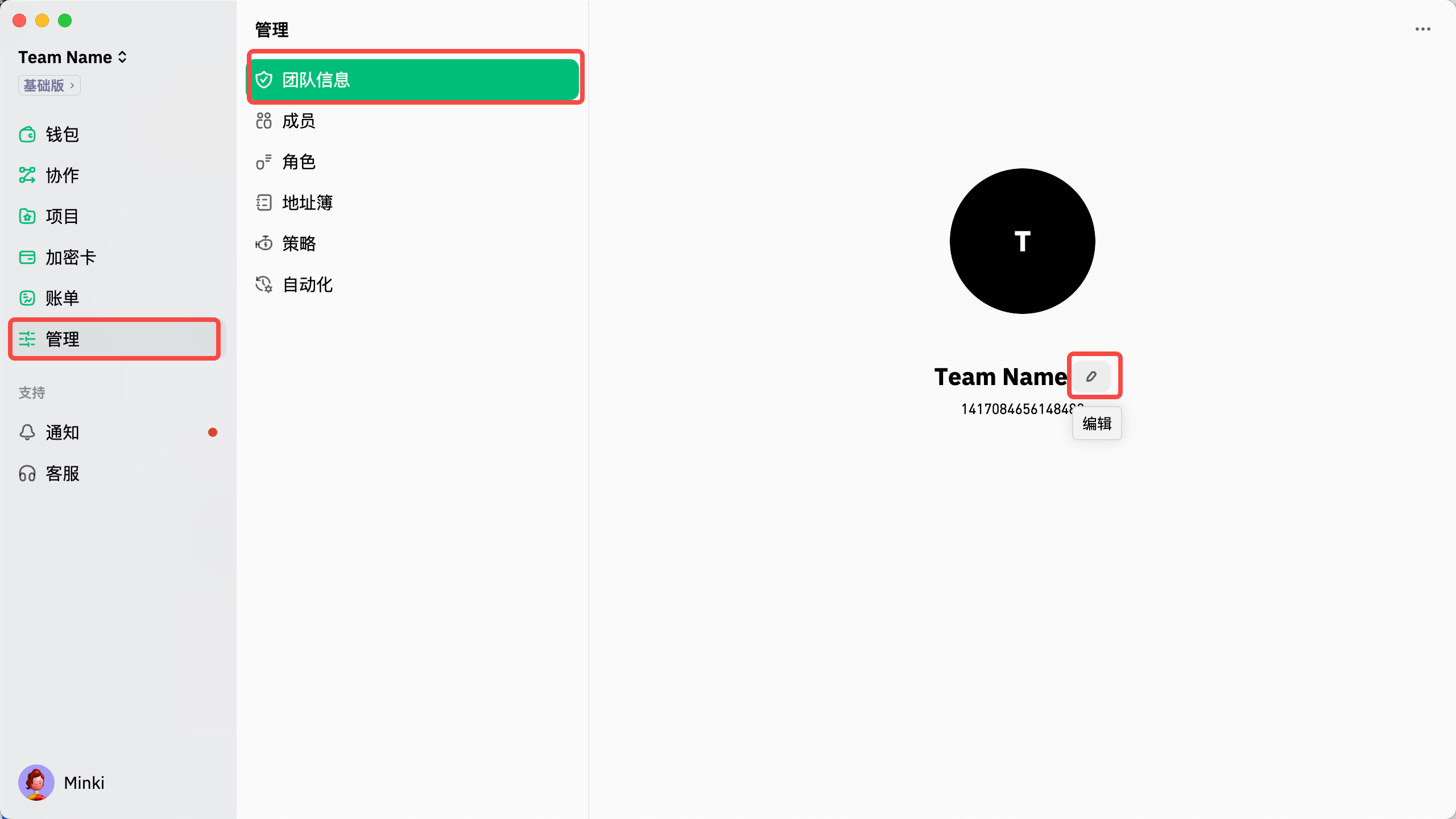 您可以通过“管理”进入团队信息页面，当鼠标悬停在团队名称上时，会显示编辑图标。