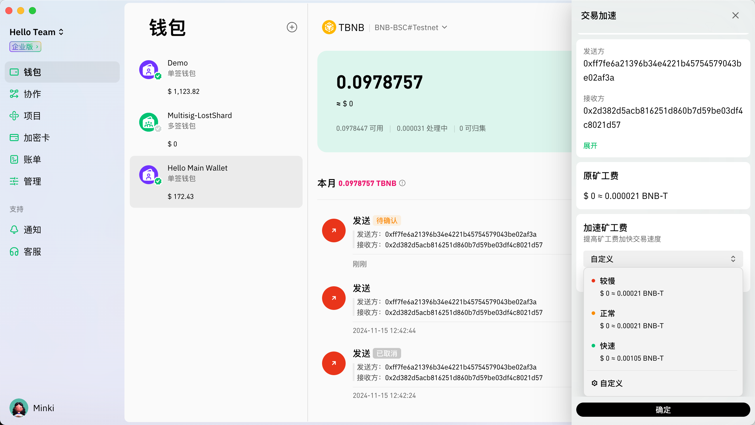 点击后会有交易详情展开，同时有加速矿工费的选项，点开可选择不同的矿工费选项，用户亦可以自定义矿工费。