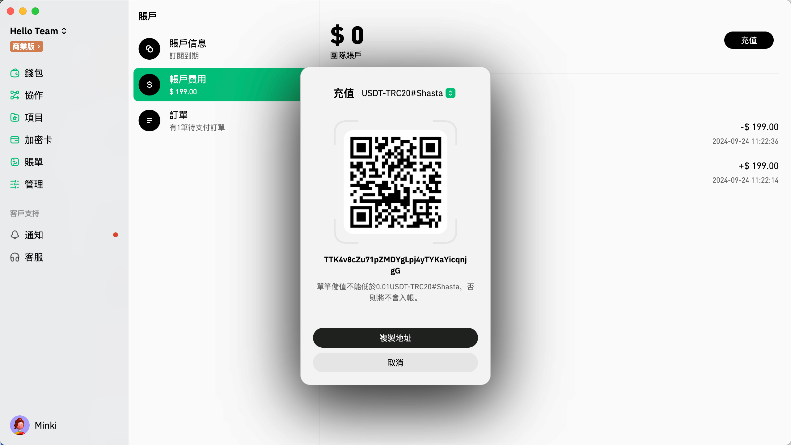 2. 點擊“充值”，彈出窗口將顯示加密地址。<br>