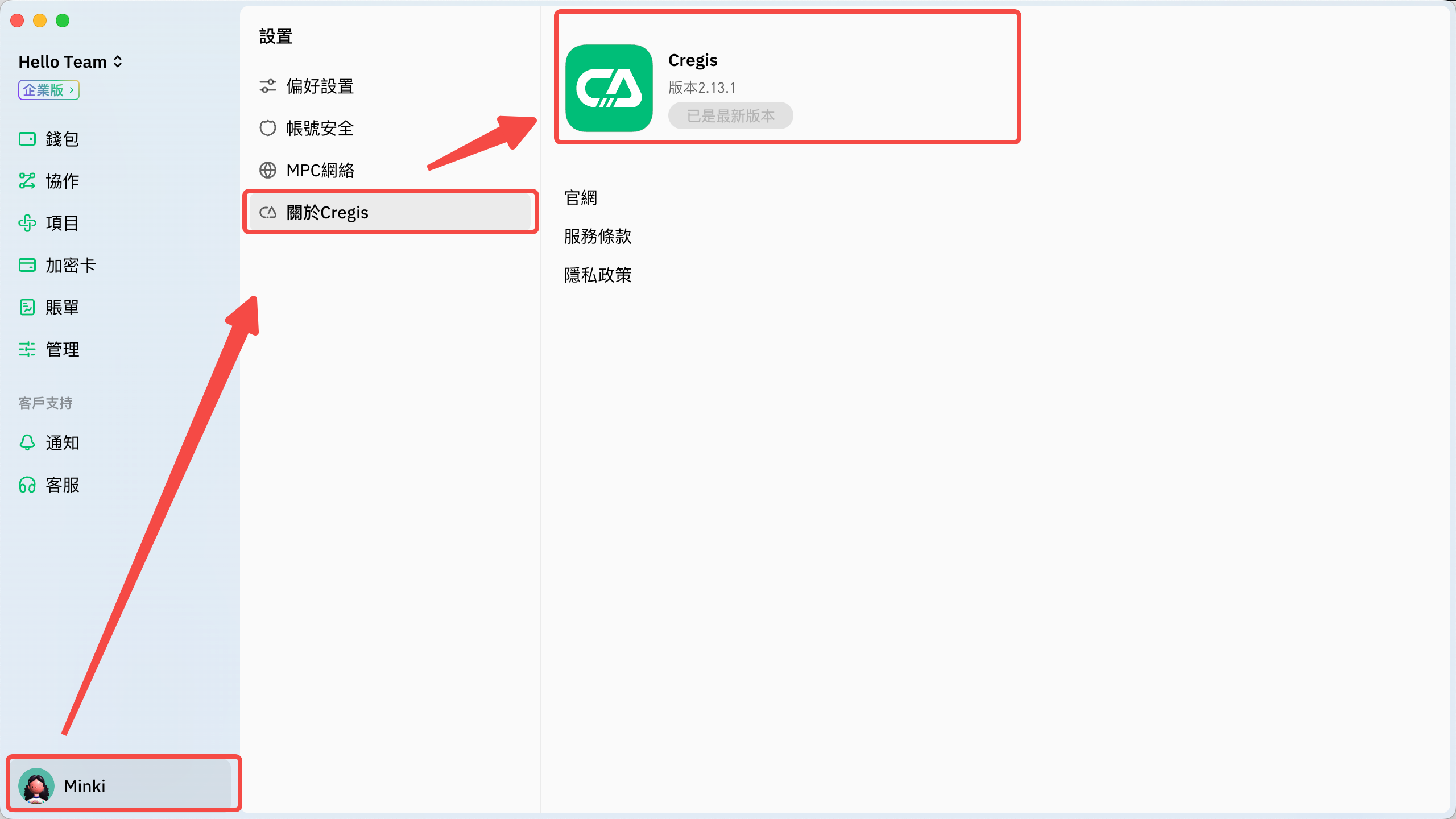 您可以根據以下圖示找到Cregis版本資訊：