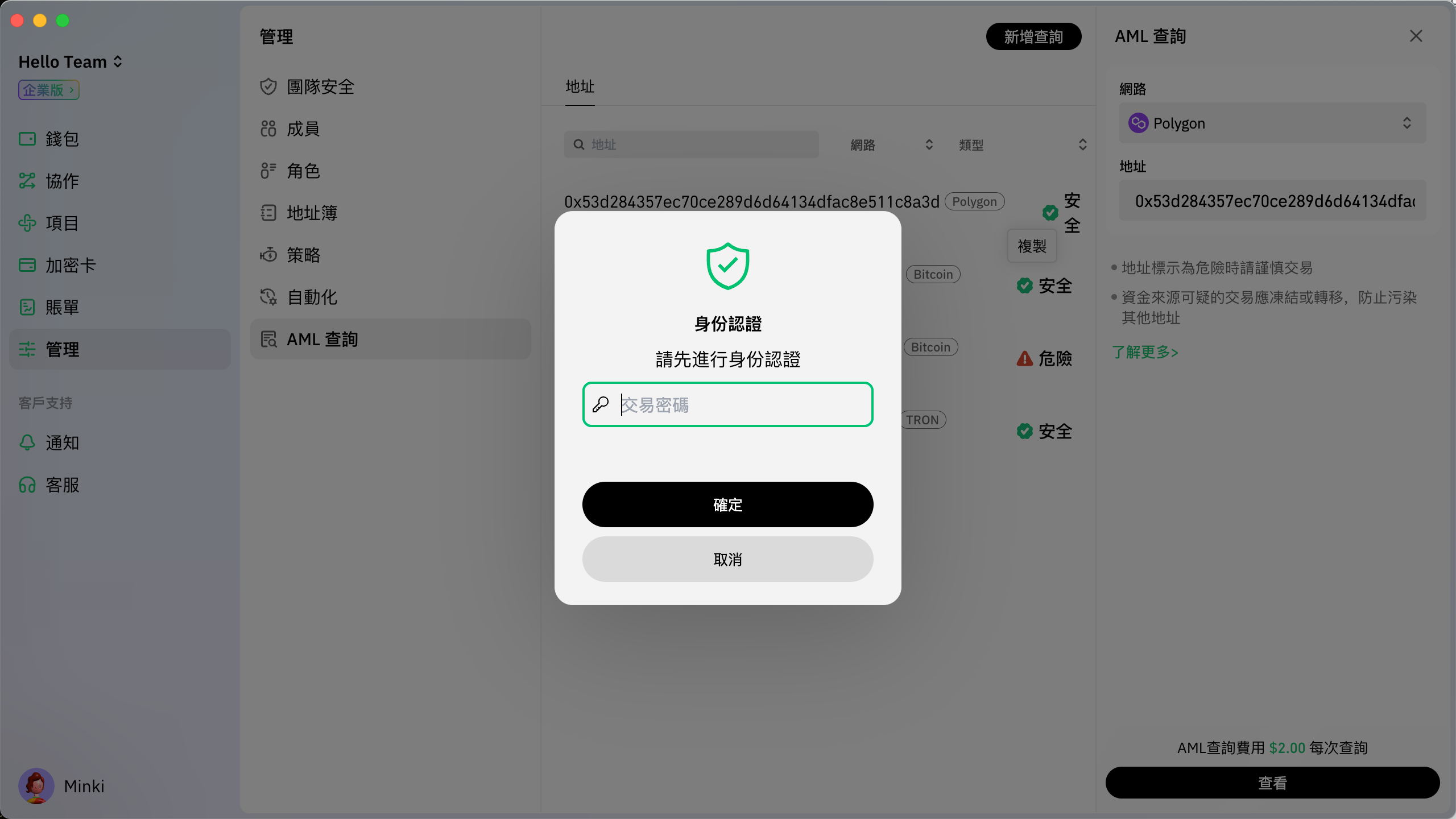 <mark style="color:green;">**在使用AML查詢功能前，請確保您是訂閱用戶，有關訂閱步驟可參考**</mark>[<mark style="color:blue;">**此頁**</mark>](https://support.cregis.com/cregis-wallet-guide/zh-tw/accountmanagement/bill_and_payment/pricing_plan)<mark style="color:green;">**。**</mark>