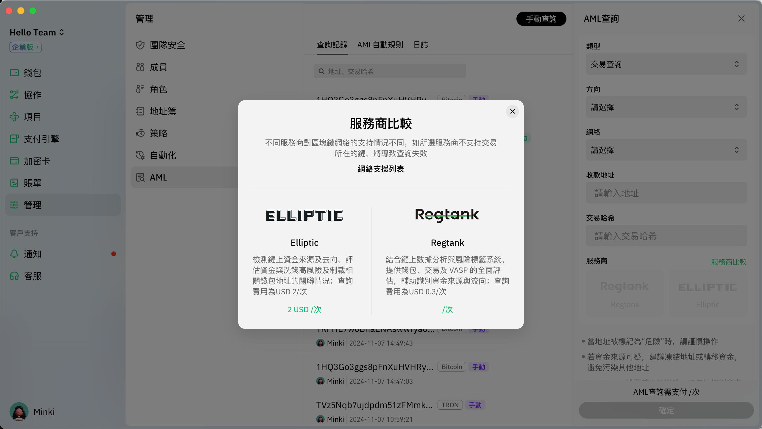 * 手動查詢幫助用戶進行地址風險評估（KYA）和交易風險評估（KYT），用戶可以發起對錢包地址或交易的AML查詢，自主選擇服務商，參考風險評估結果，採取相應風險管理措施。