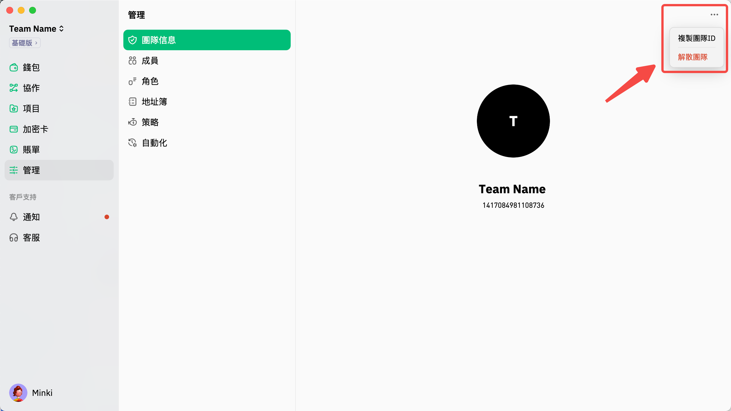 您可以通過“管理”進入團隊信息頁面，然後點擊右上角的<img src="https://3200384756-files.gitbook.io/~/files/v0/b/gitbook-x-prod.appspot.com/o/spaces%2FPoazW59IJbERNbp3S6uz%2Fuploads%2FgWfFJaBa6Te2bUyjQjMs%2Fimage.png?alt=media&#x26;token=1c71c45a-6b6a-4595-bce5-4d908e2f4503" alt="" data-size="line">按鈕，查看解散團隊的選項。