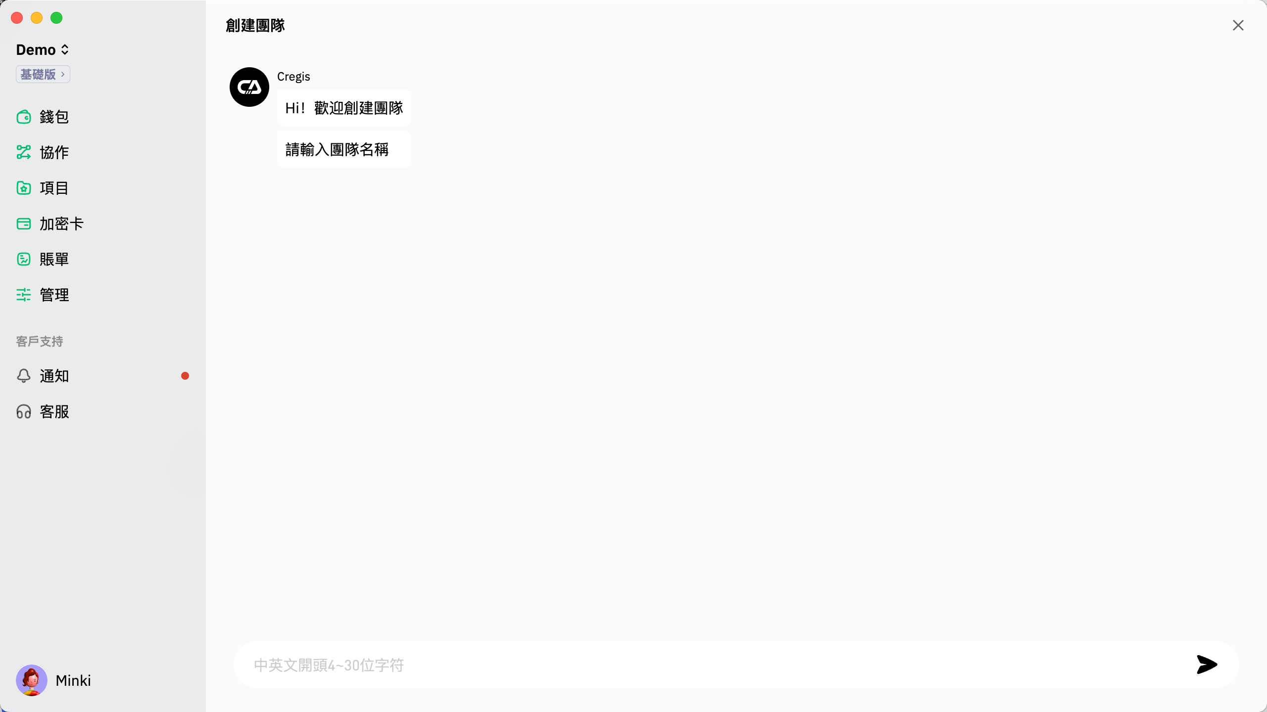 點擊後，您將進入創建團隊頁面，您需要在對話框中輸入您的團隊名稱。請注意，團隊名稱必須為4到30個字符之間。