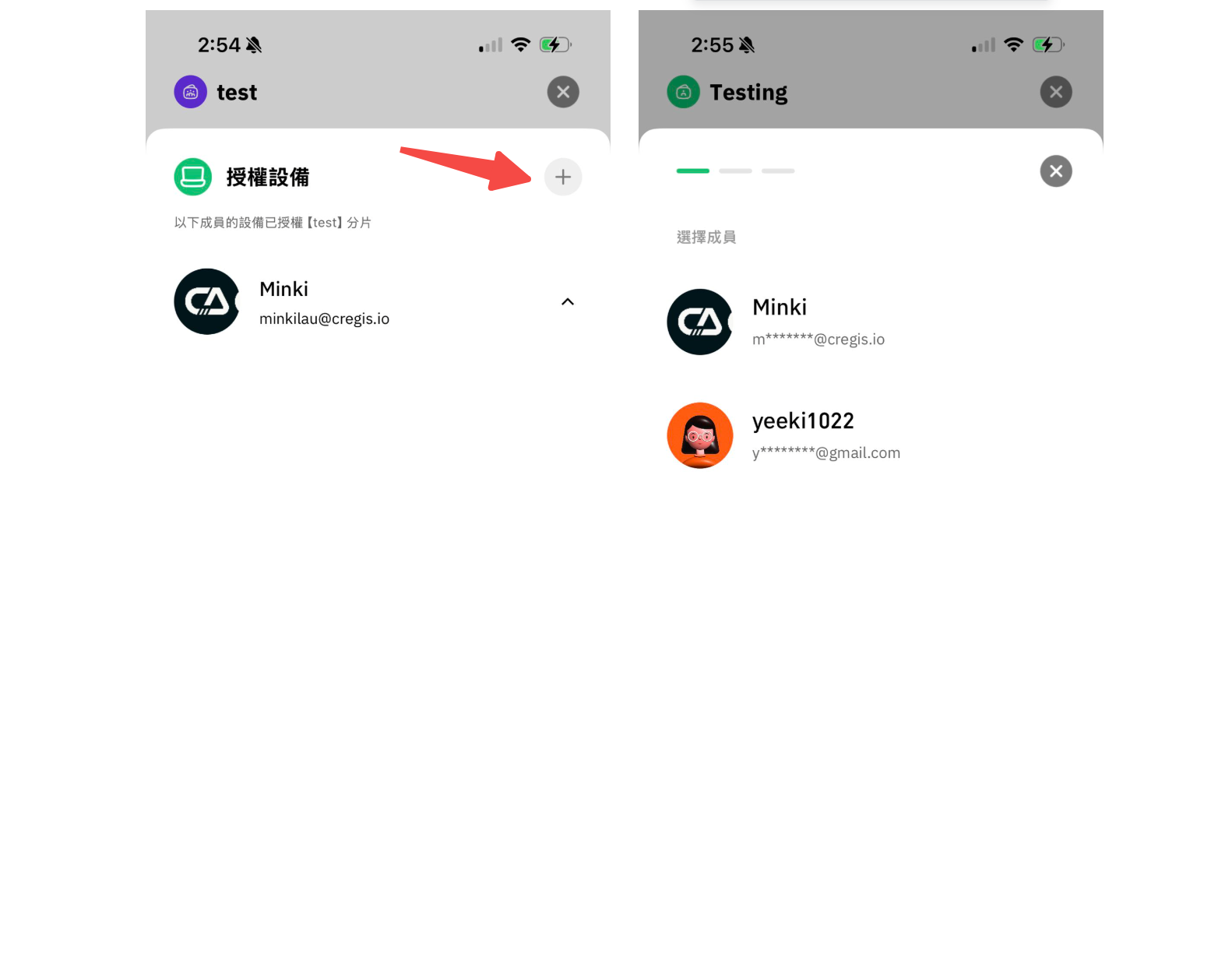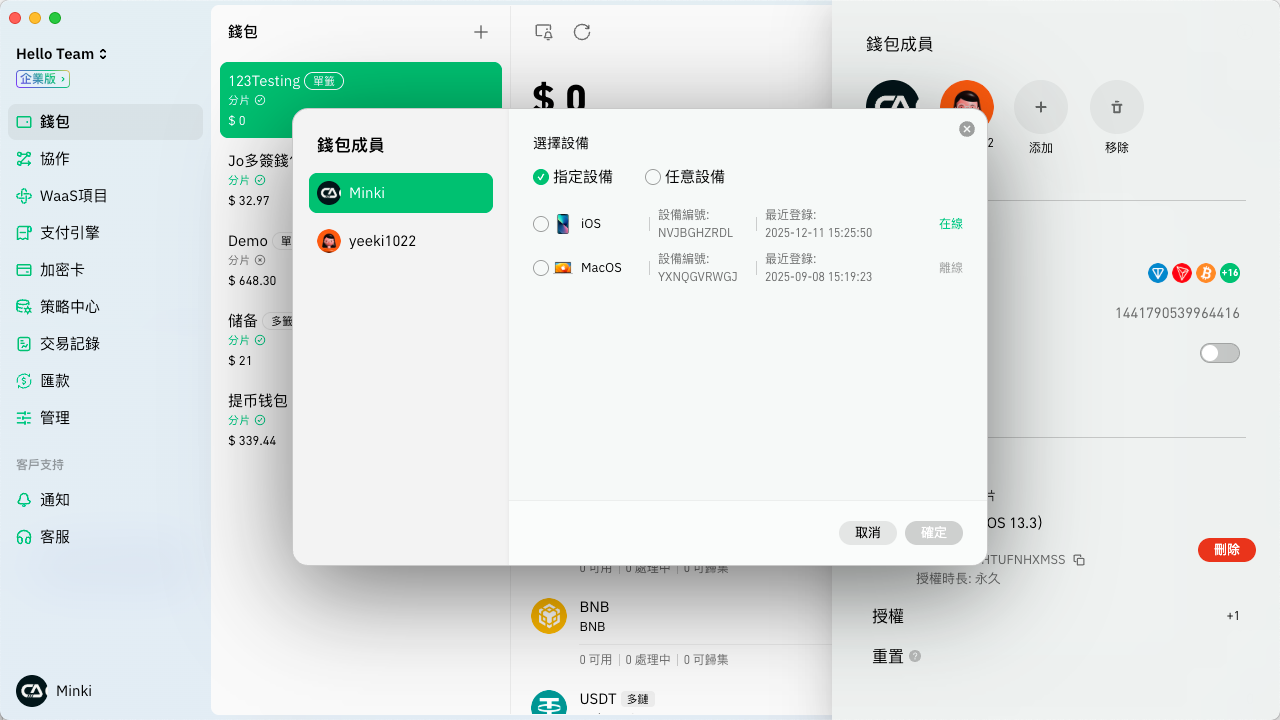 4. 您可以選擇想授權的錢包成員及其設備，也可以選擇「任意設備」，即該成員可用任意設備接受分片授權。