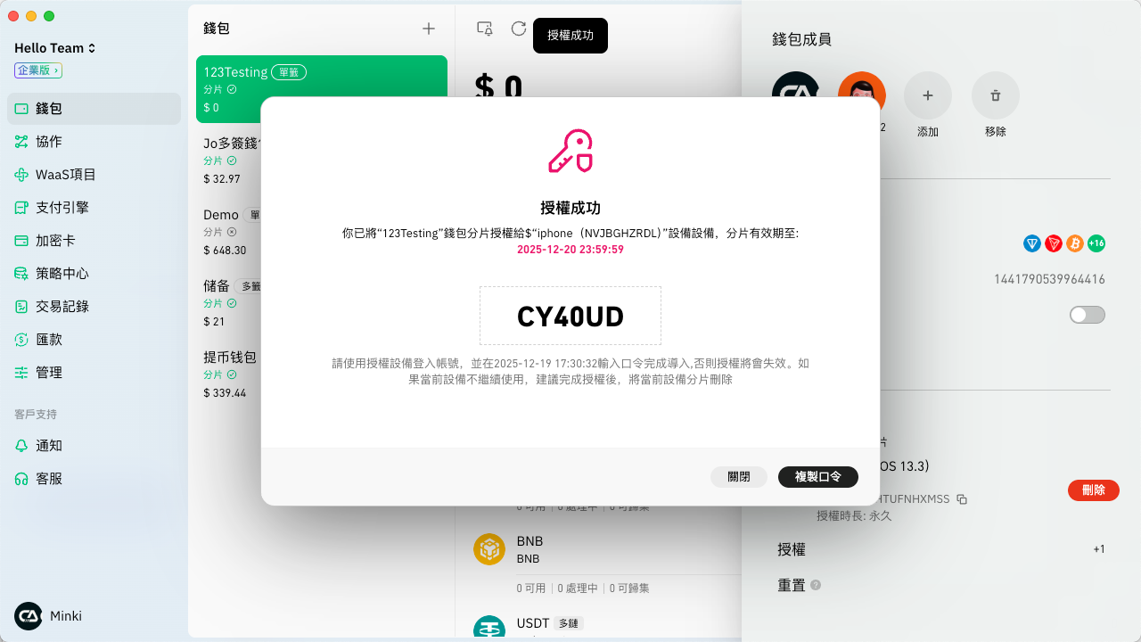 7. 完成驗證後會生成一次性授權口令，請複製給該成員，讓其到指定設備上導入。<mark style="color:green;">**如果當前設備不再繼續使用，建議完成授權後將當前設備上的分片刪除。**</mark><br>