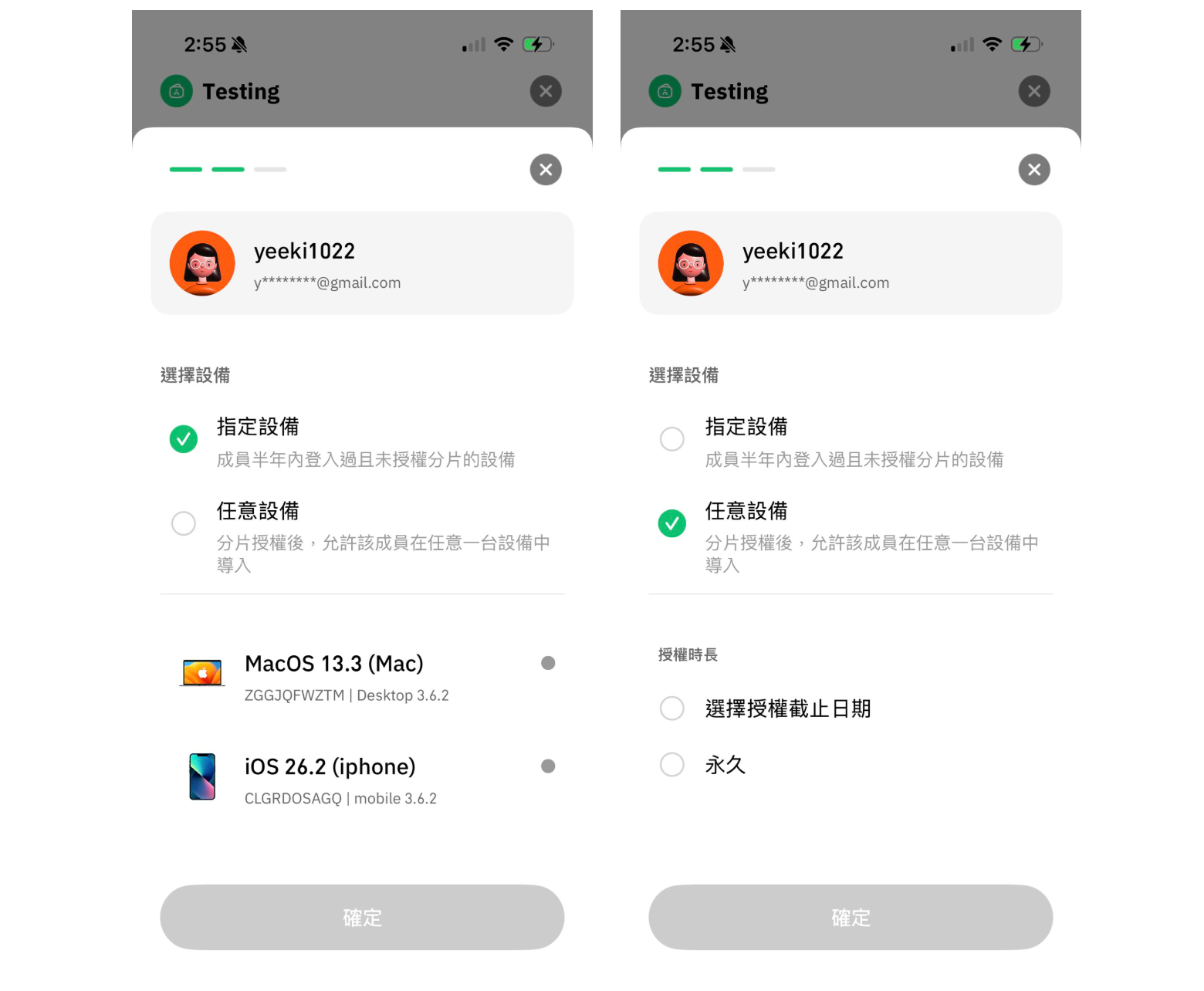 在選擇設備是可查看到所有成員用來登入的設備，選擇好設備後可決定授權時長，然後點擊確定。