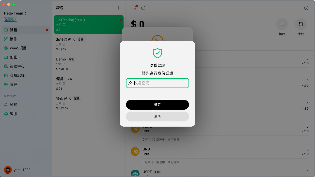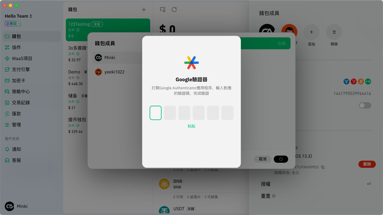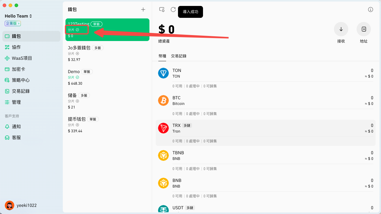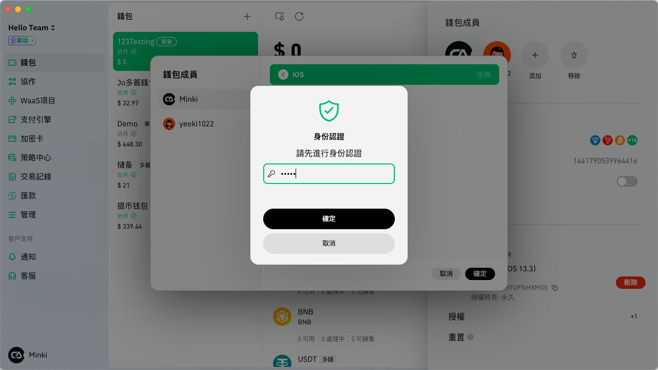 被授權成員只要切換到該團隊並進入錢包頁面，即會彈出驗證口令的視窗，只要輸入相應口令並逵行密碼驗證便可成功導入分片。