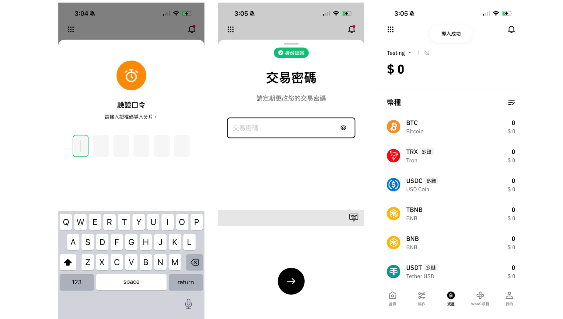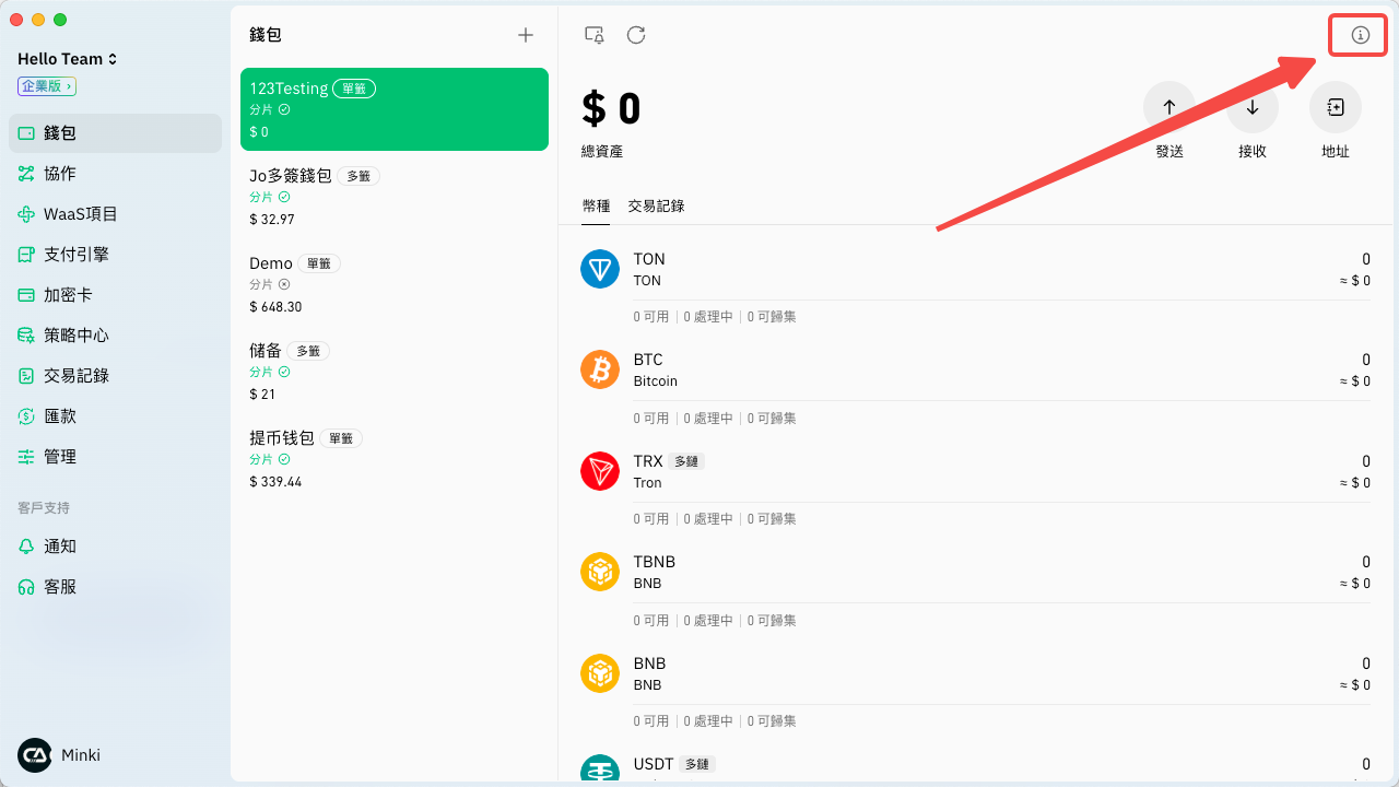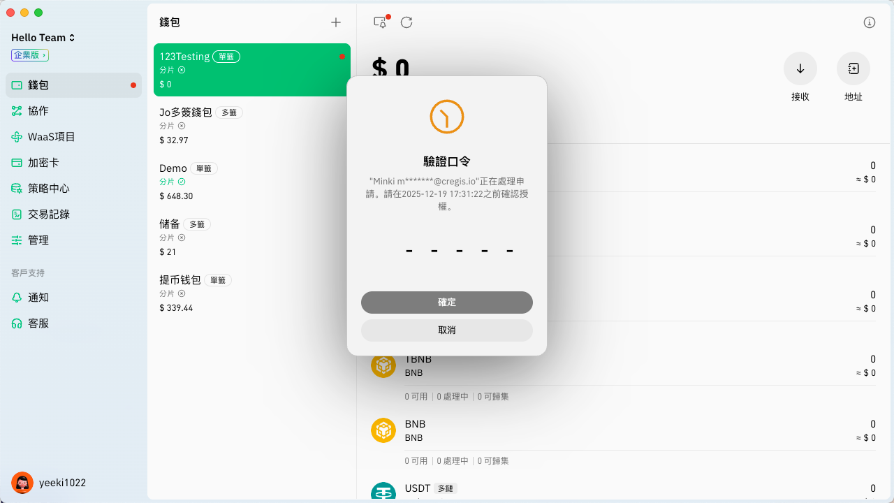 被授權成員只要切換到該團隊並進入錢包頁面，即會彈出驗證口令的視窗，只要輸入相應口令並逵行密碼驗證便可成功導入分片。