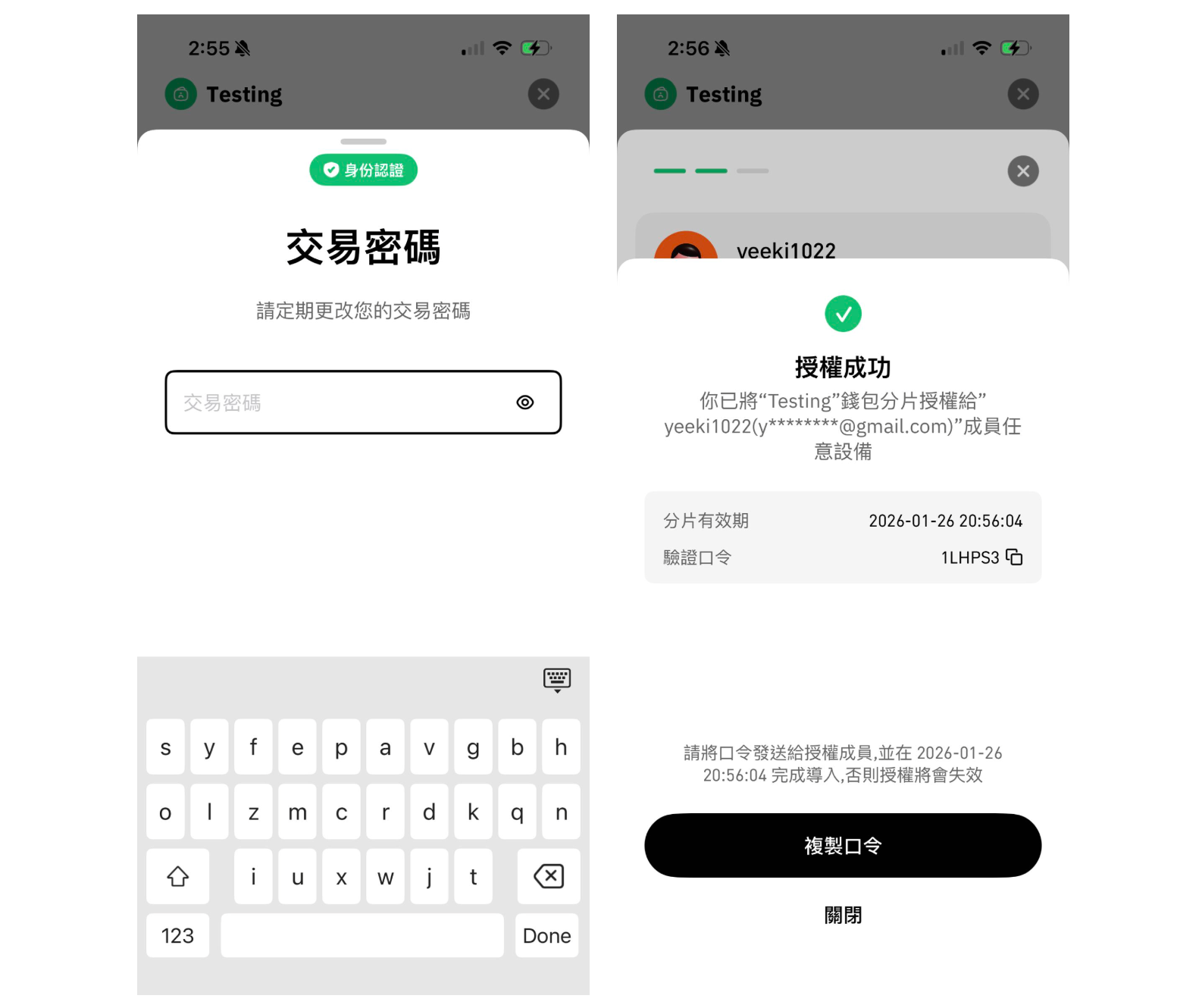 確認後需再進行雙重驗證，驗證成功後緊記複製口令給授權成員用於導入分片。