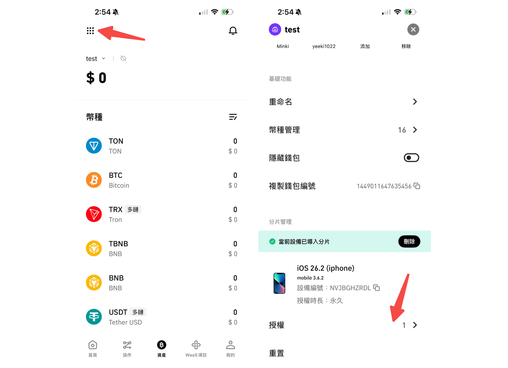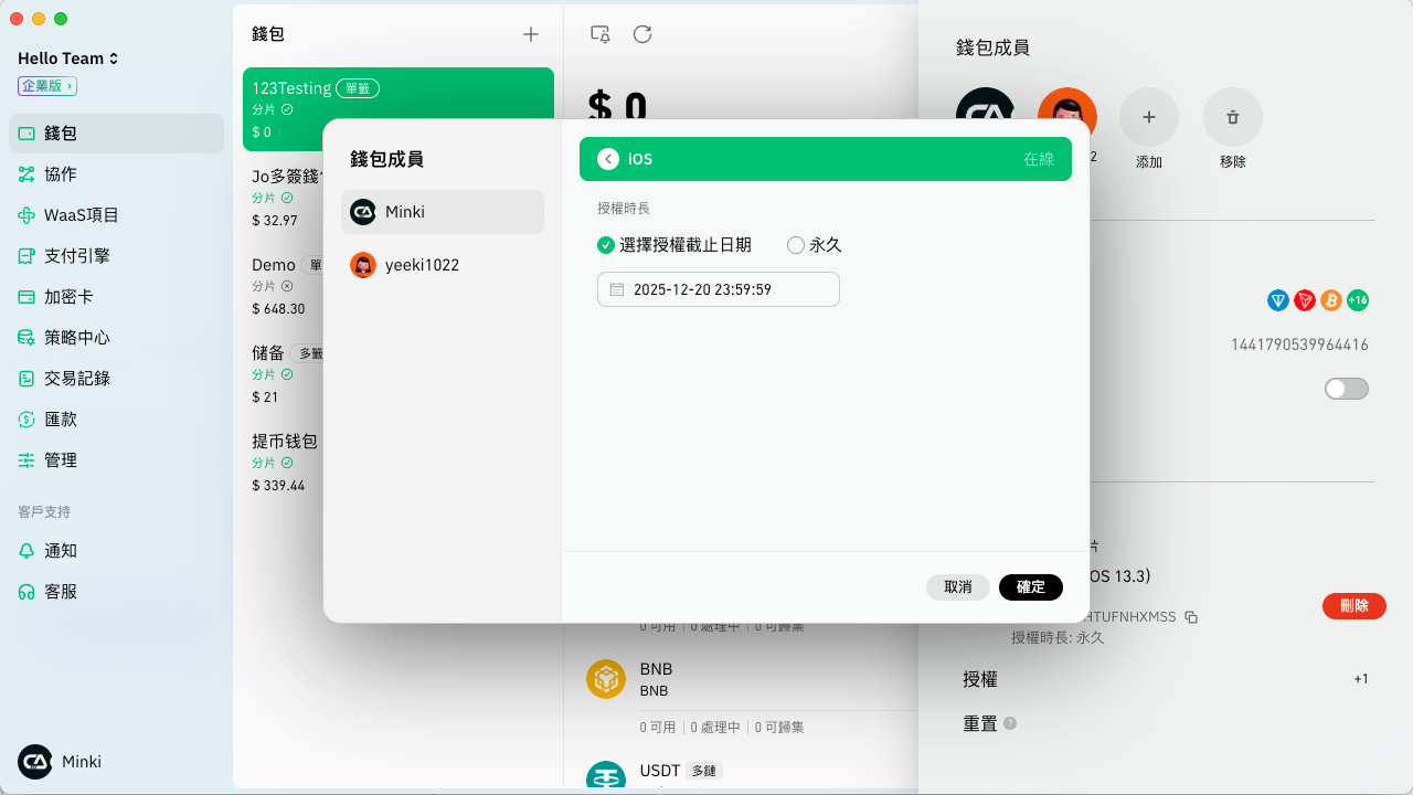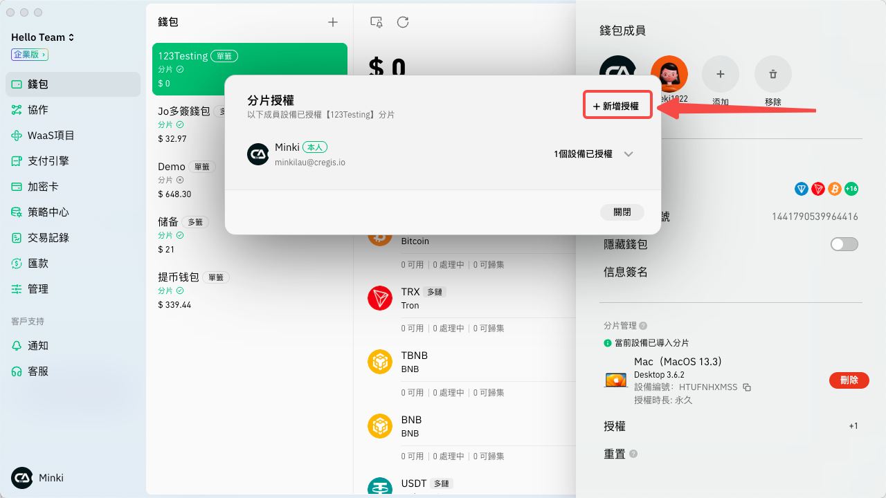 * <mark style="color:green;">**注意多簽錢包不支援授權分片給其他錢包成員。**</mark>