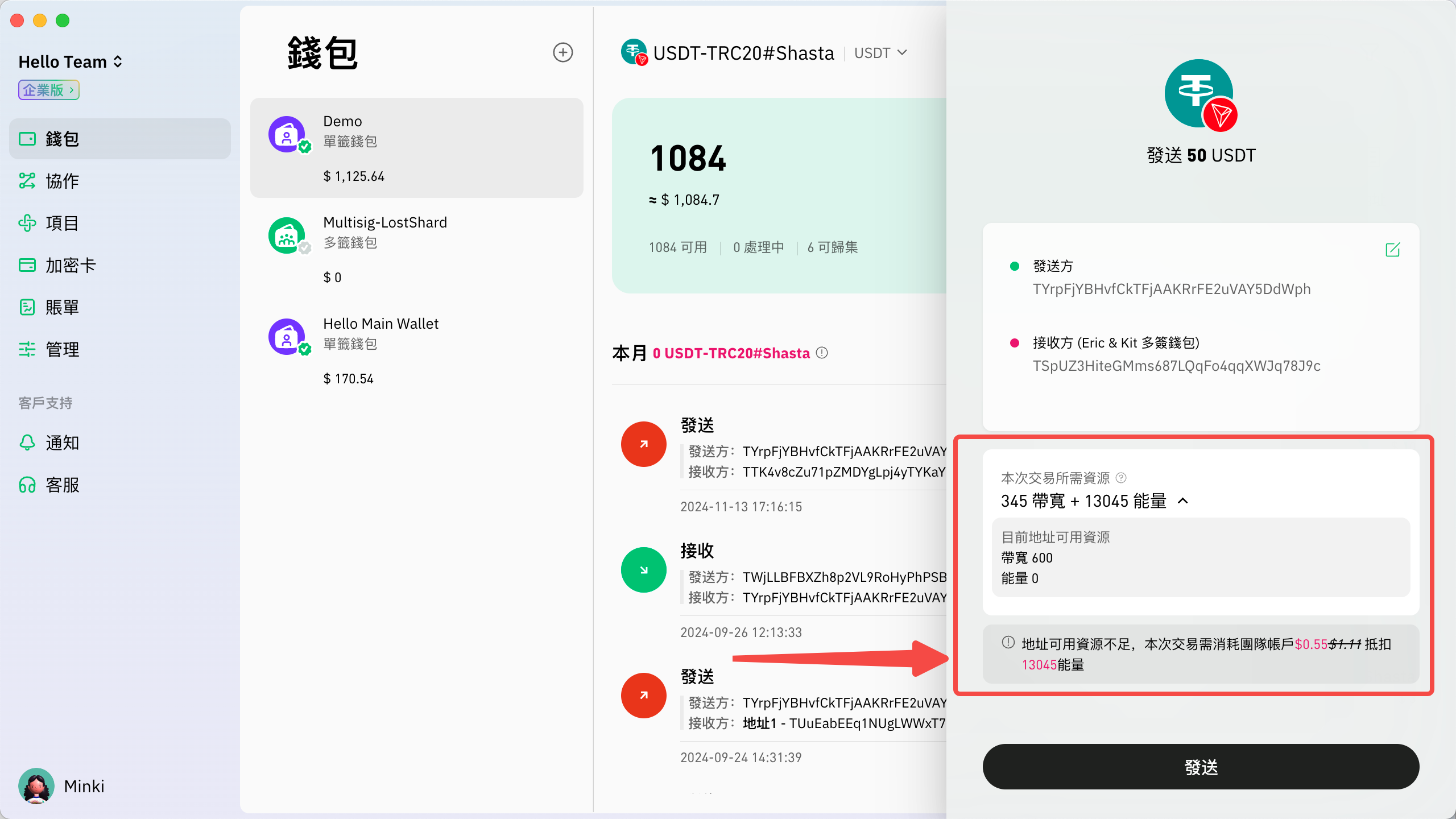 如果您的地址中沒有能量，系統將檢查您的賬戶USD餘額。如果賬戶餘額足夠支付此次交易的能量費用，系統將自動計算所需的USD金額。\