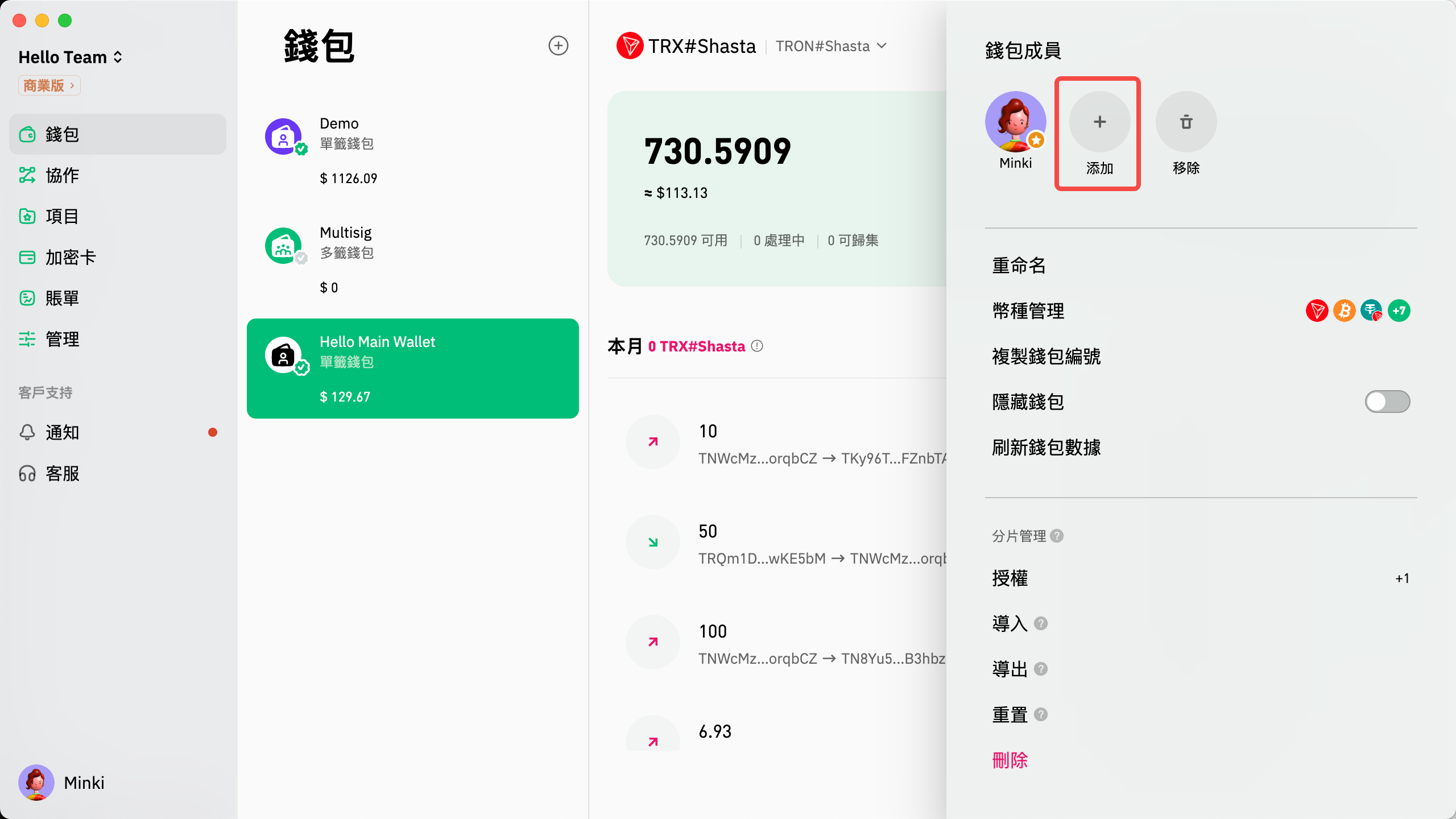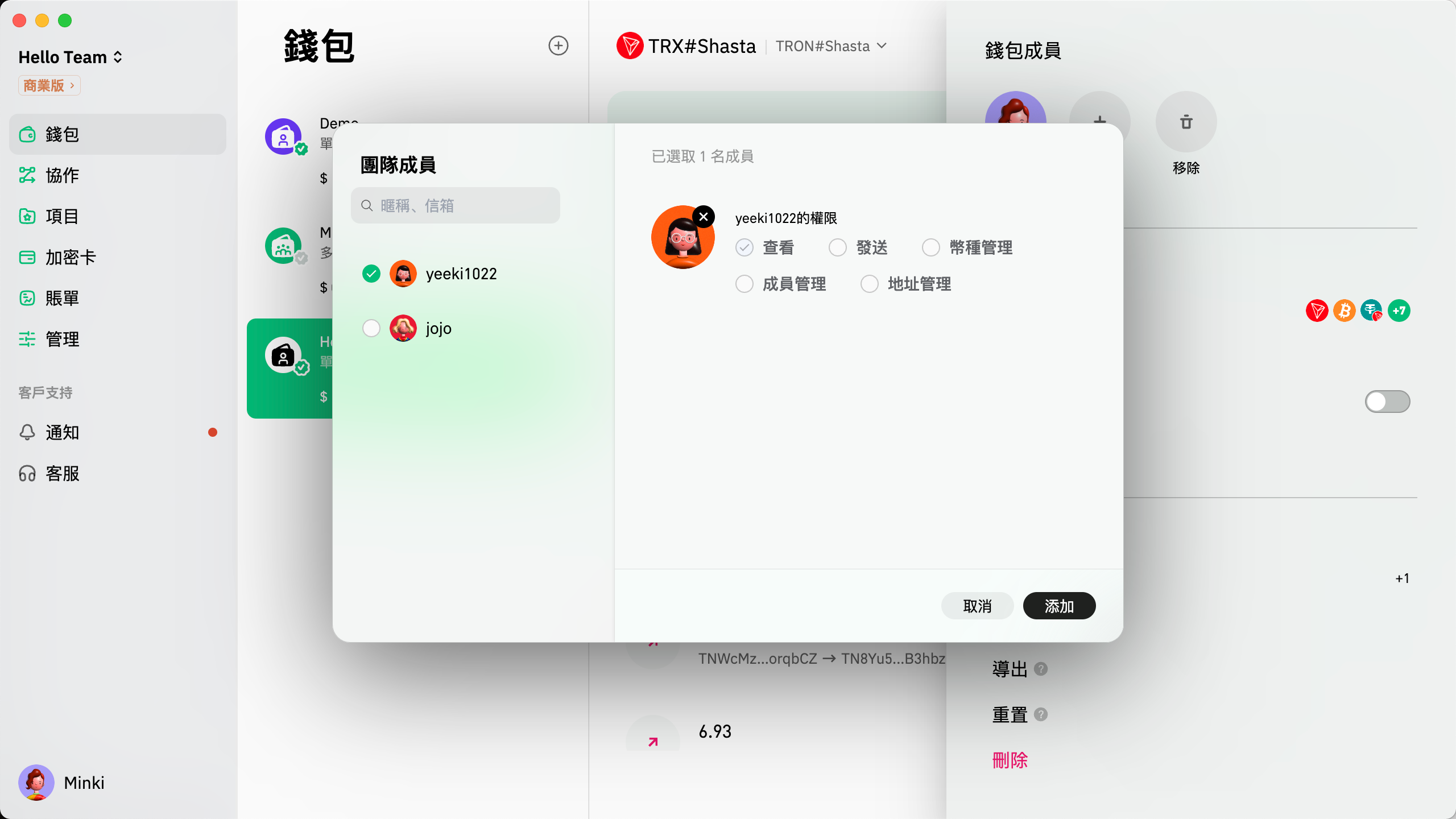 點擊錢包管理下的圖標，選擇成員並編輯他們的權限，最後按“添加”便可完成。