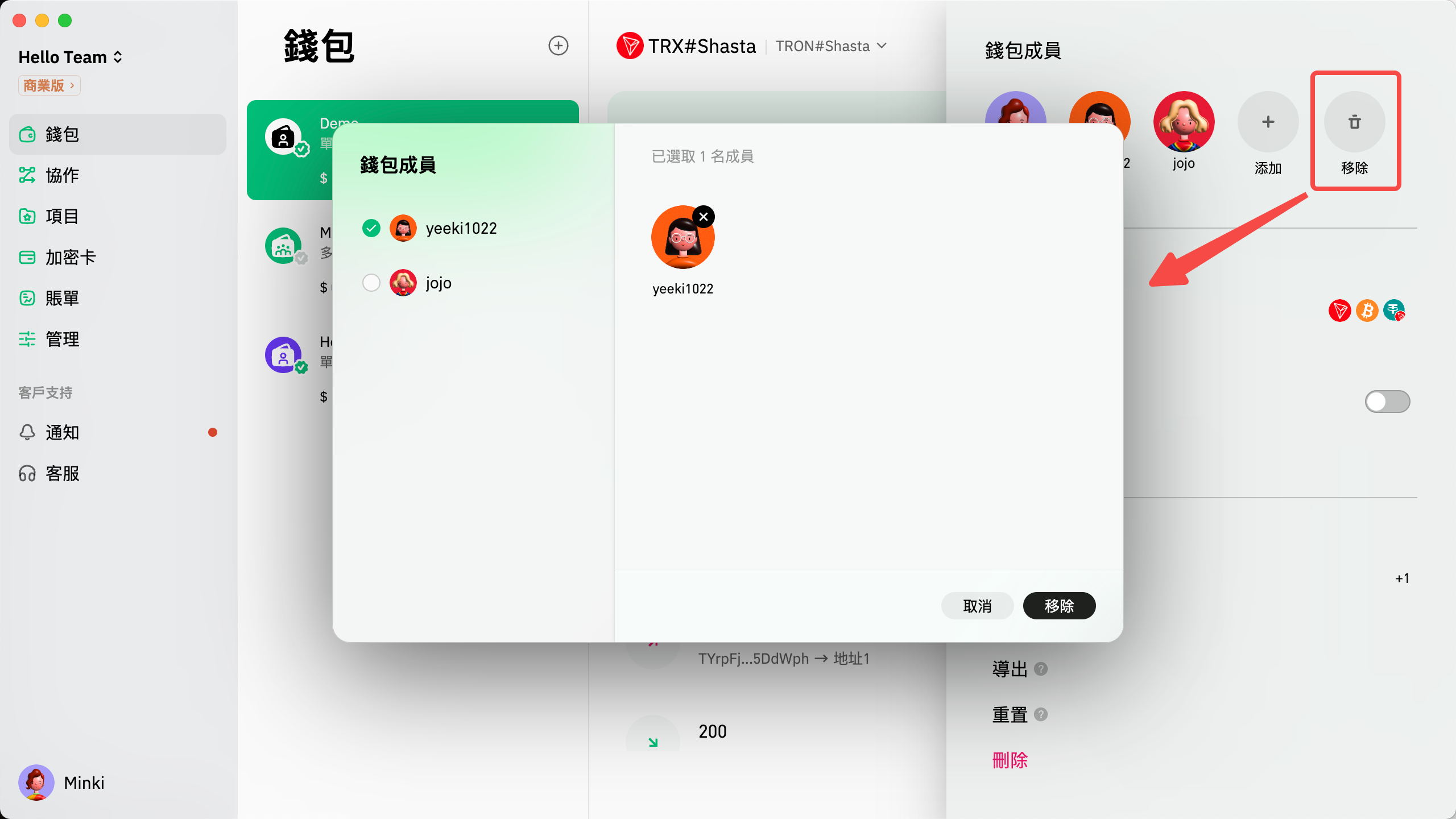 點擊錢包管理下的圖標，將彈出一個窗口。然後您可以選擇要移除的成員，點擊“移除”以確認更改。